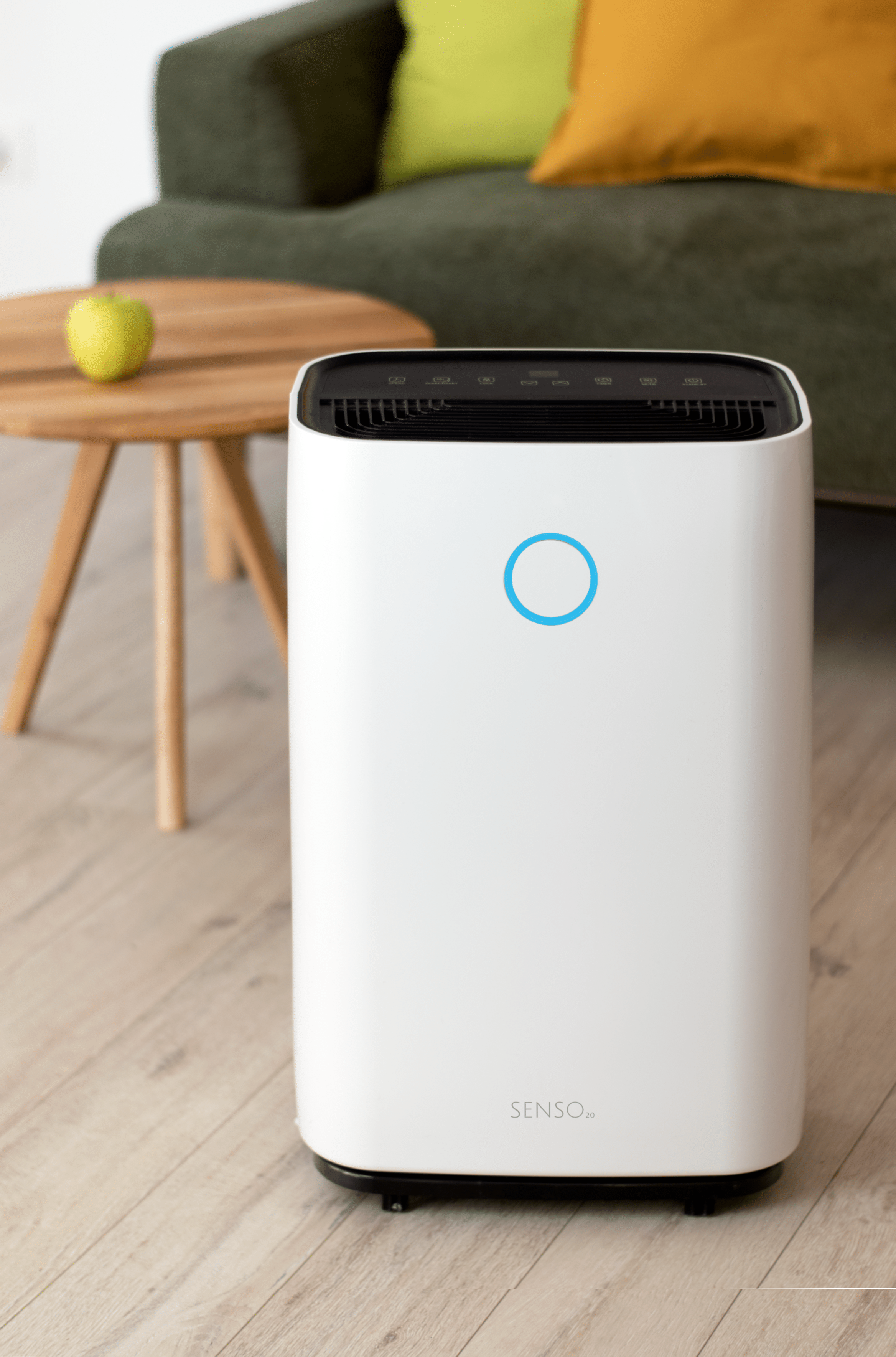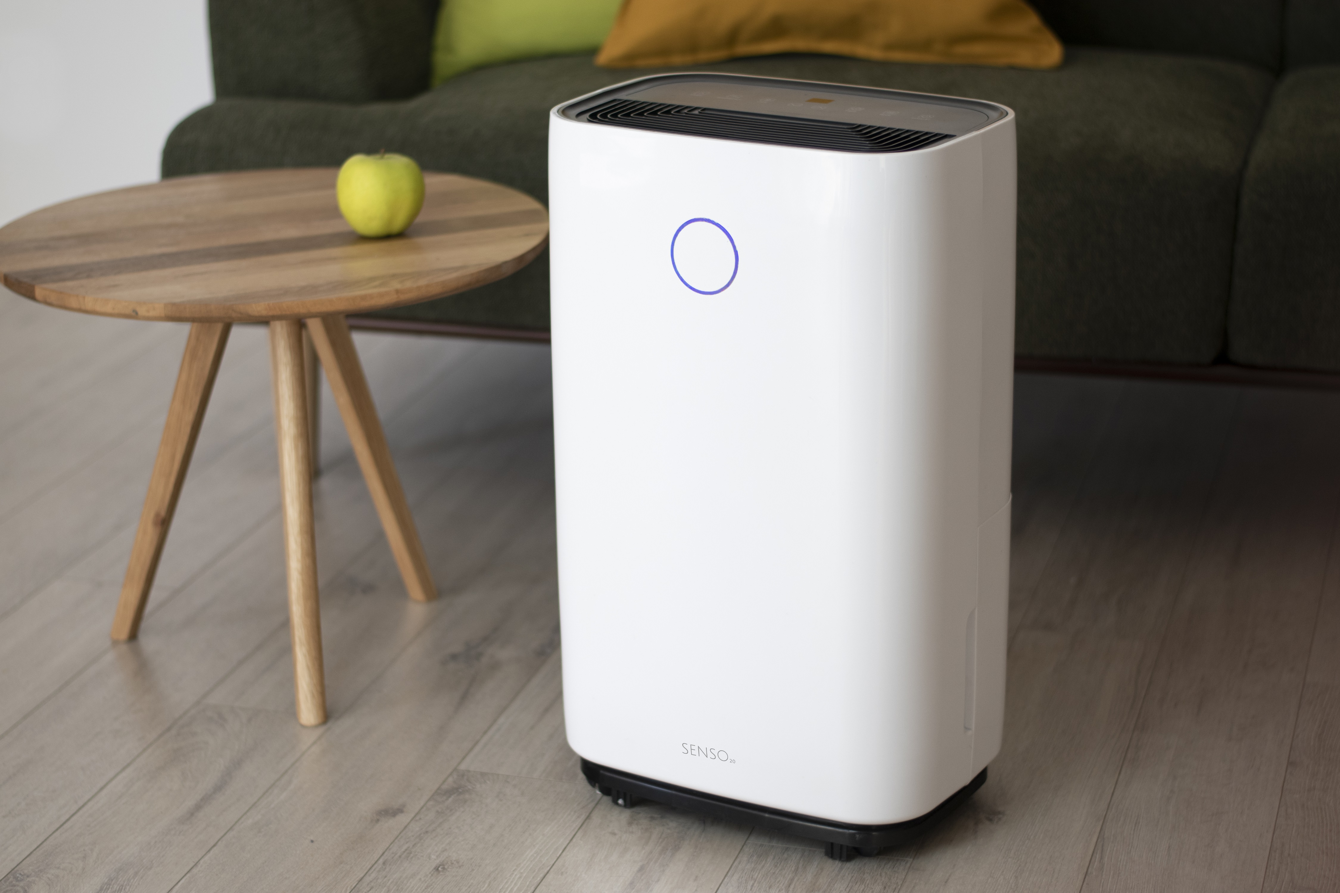 Mit dem Luftentfeuchter Turbionaire SENSO 20 können Sie dank der kreisförmigen LED-Feuchtigkeitsanzeige an der Vorderseite des Geräts auf einen Blick erkennen, ob die Luftfeuchtigkeit im Raum im gesunden Bereich liegt. Die Farbe ändert sich je nach Luftfeuchtigkeit im Raum: